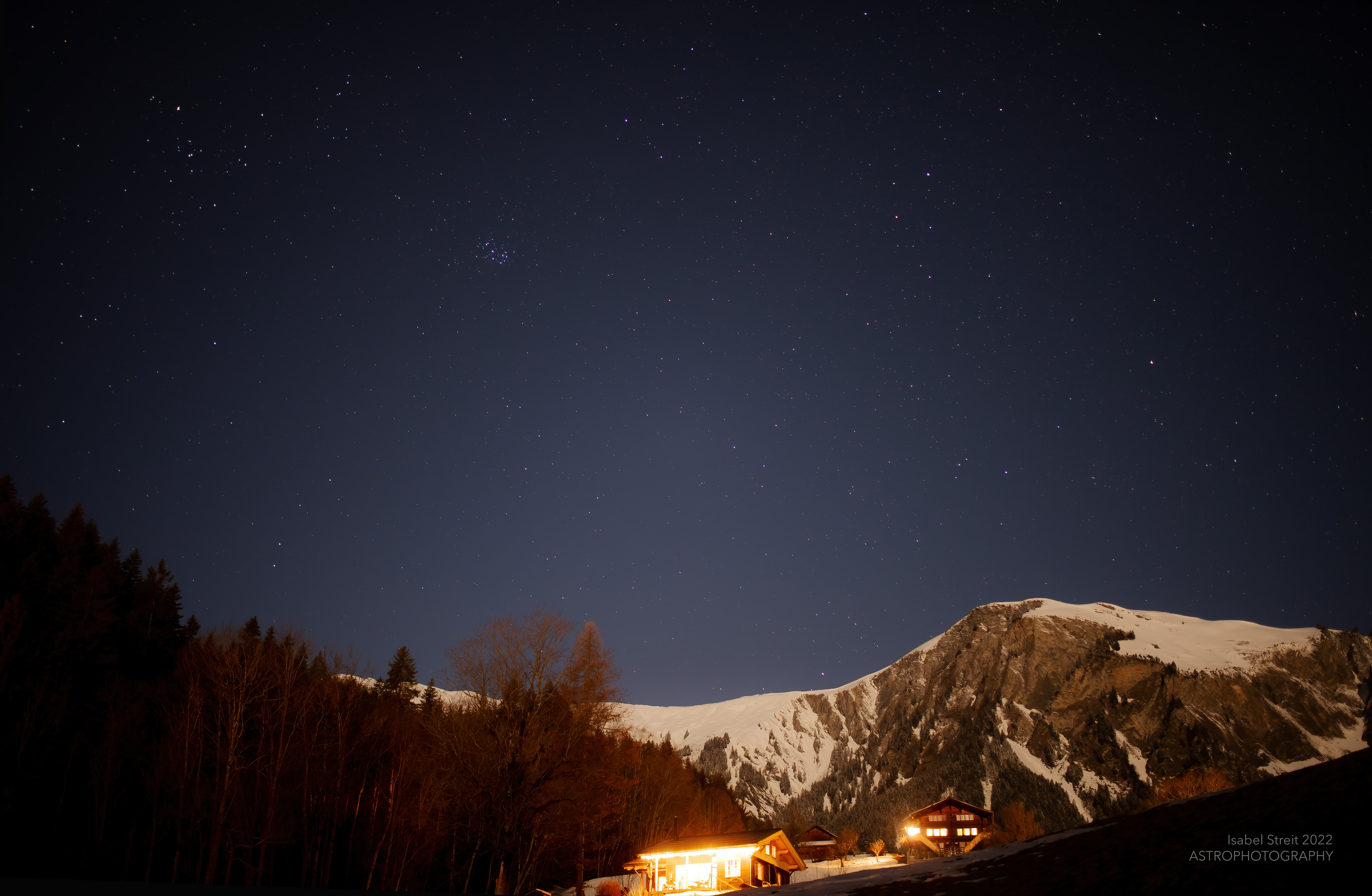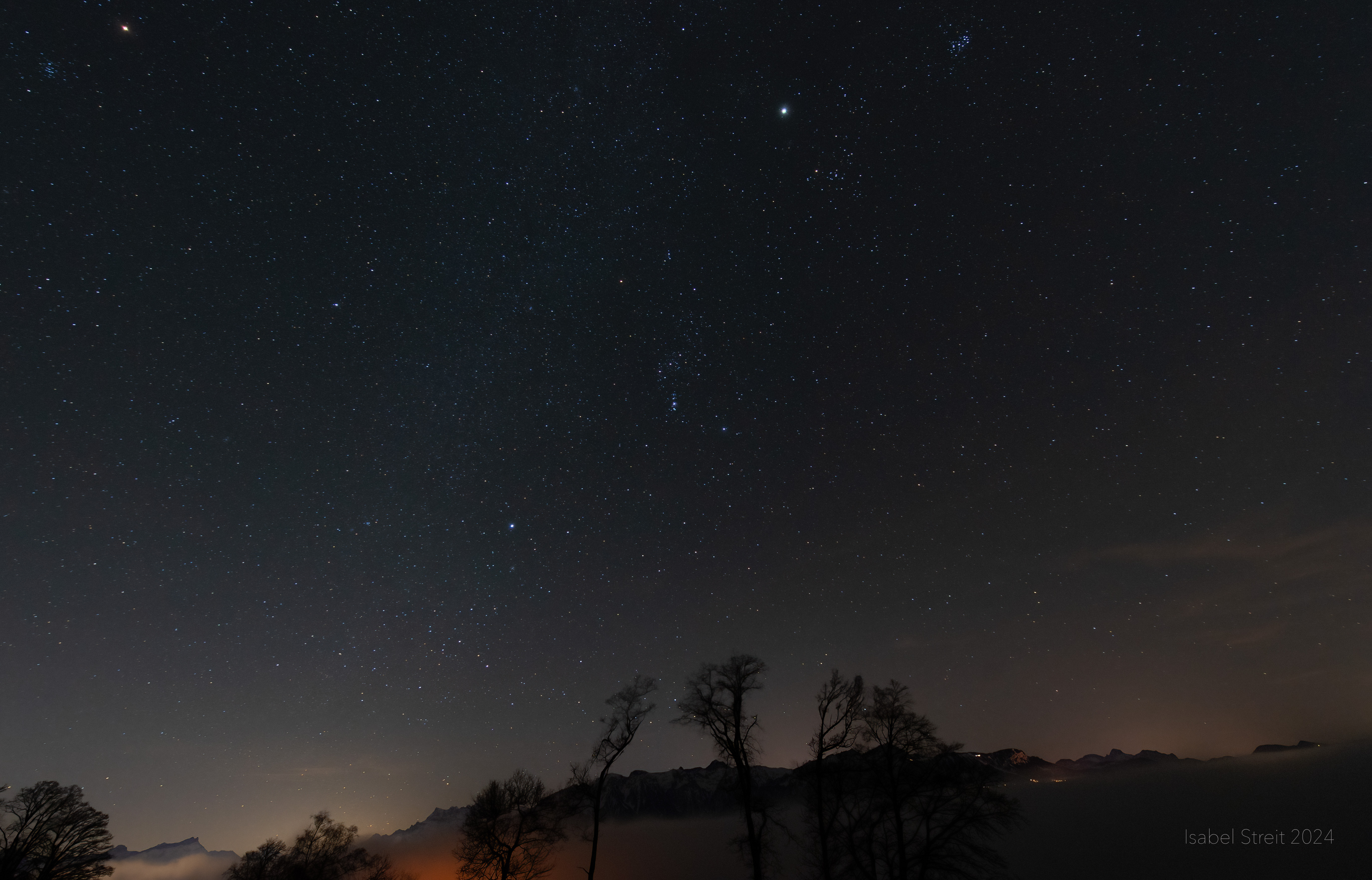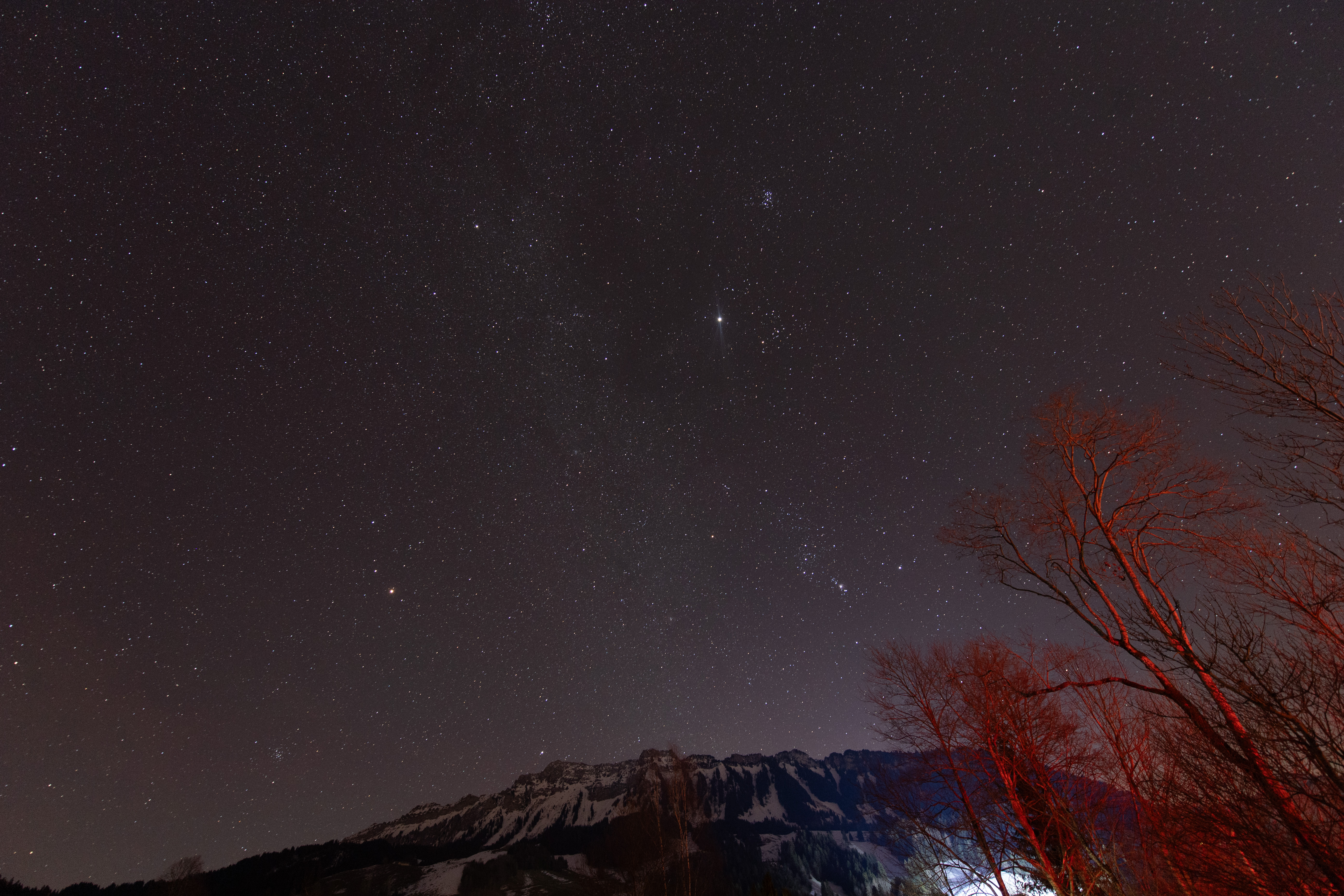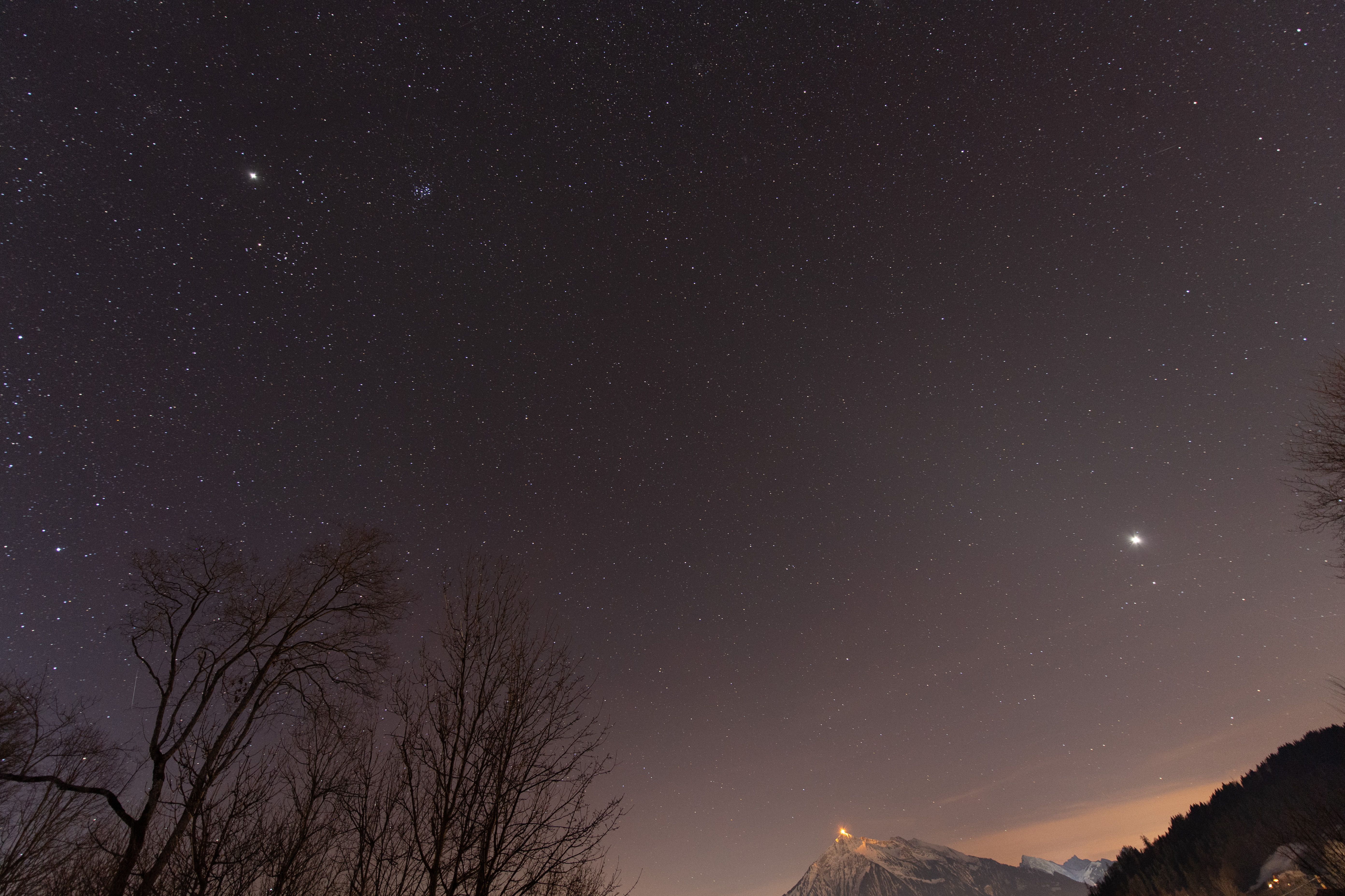 Orion and Jupiter over the JuraJanuary 2025Winter Constellations over Mont PèlerinDecember 2024Taurus and the PleiadesLenk, February 2022Andromeda, Perseus and CassiopeiaDecember 2020Venus over the Franches-MontagnesJanuary 2025Planets over Schwanden IJanuary 2025Planets over Schwanden IIJanuary 2025JupiterDecember 2020Starry NightDecember 2020Wasserschloss MontmagnyOctober 2022Lugano at NightNovember 2023